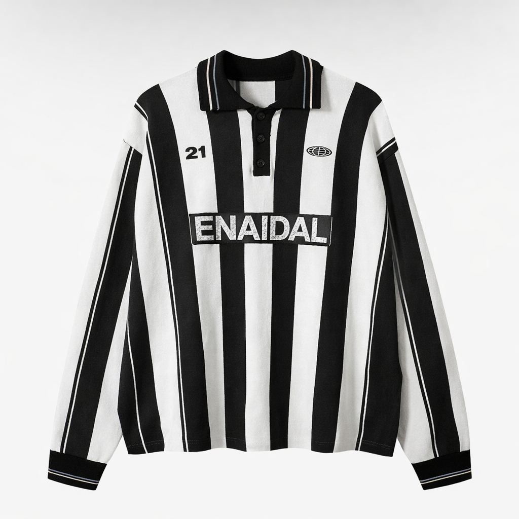 La camiseta polo ENAIDAL representa una visión refinada del streetwear contemporáneo, combinando rayas verticales en blanco y negro con una silueta atemporal y elegante.
