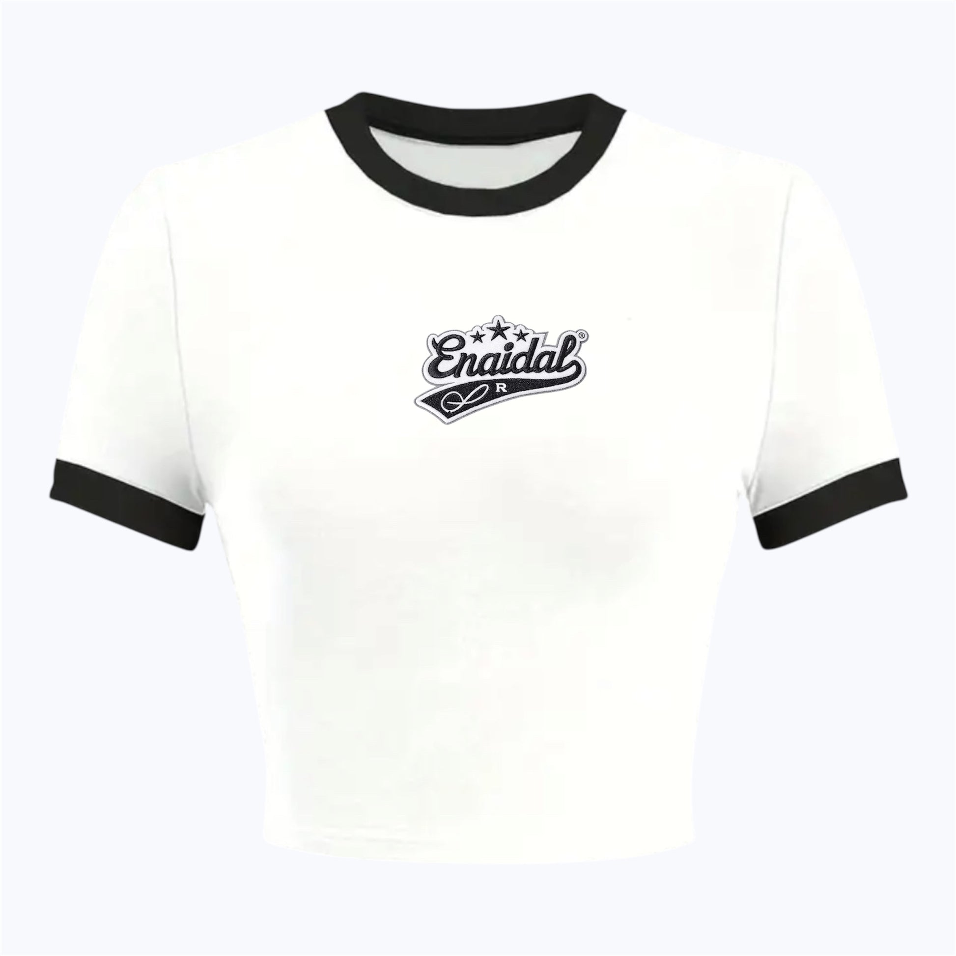 Refresca tu look veraniego con esta camiseta tipo top casual para mujer. Su diseño corto y holgado, con cuello redondo clásico y mangas en contraste, combina estilo deportivo con un toque moderno.
