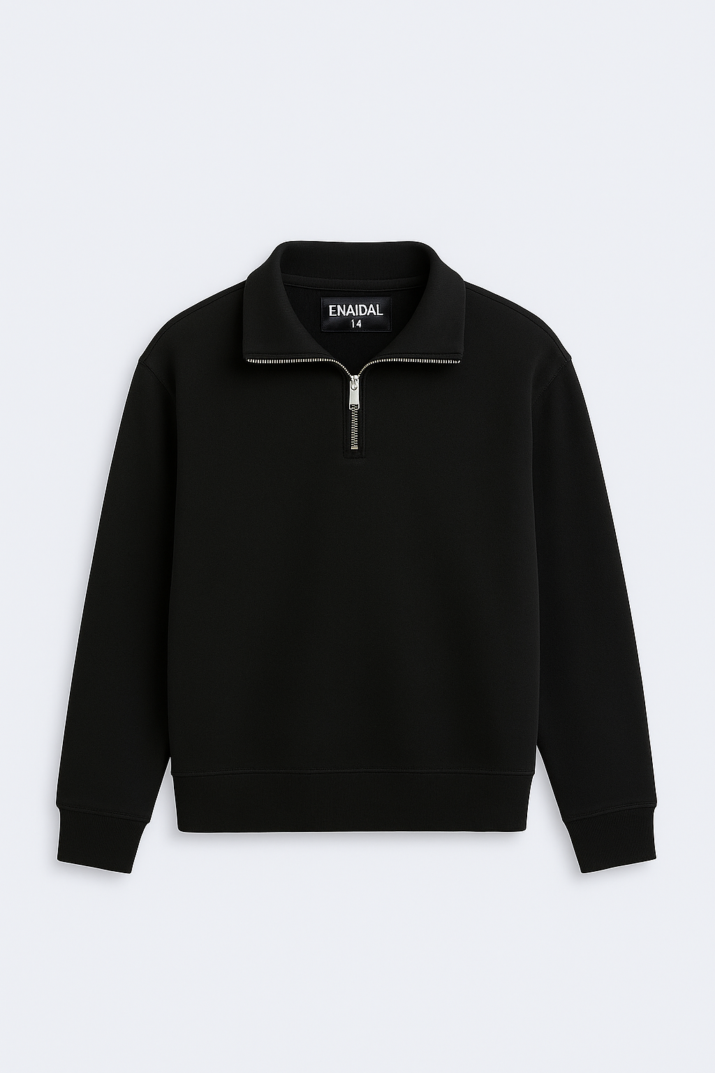 Sudadera unisex de corte moderno con media cremallera metálica y cuello alto, diseñado para un estilo versátil y elegante. Confeccionado en tejido suave y duradero, incorpora acabados acanalados en puños y bajo para mayor comodidad.