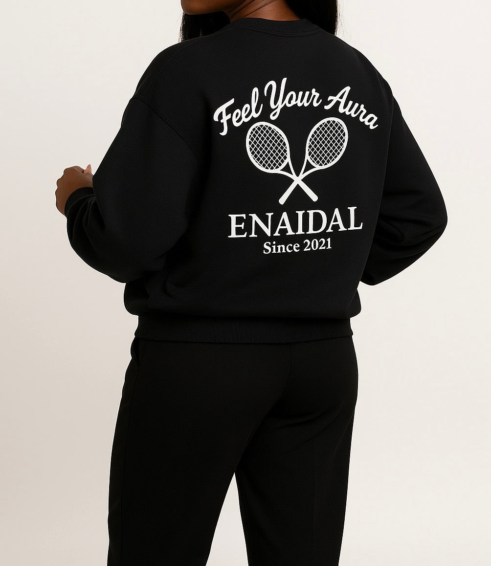 El diseño trasero presenta el mensaje manuscrito “Feel Your Aura” junto a las raquetas cruzadas emblemáticas de la firma y la inscripción “ENAIDAL Since 2021” en tipografía serif clásica serigrafiada en blanco de alta durabilidad.