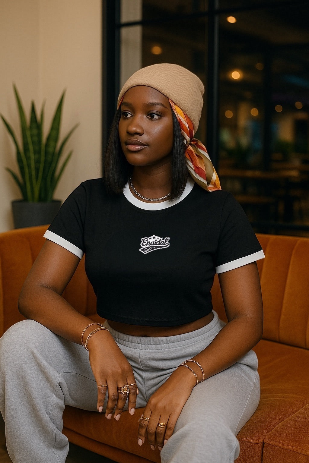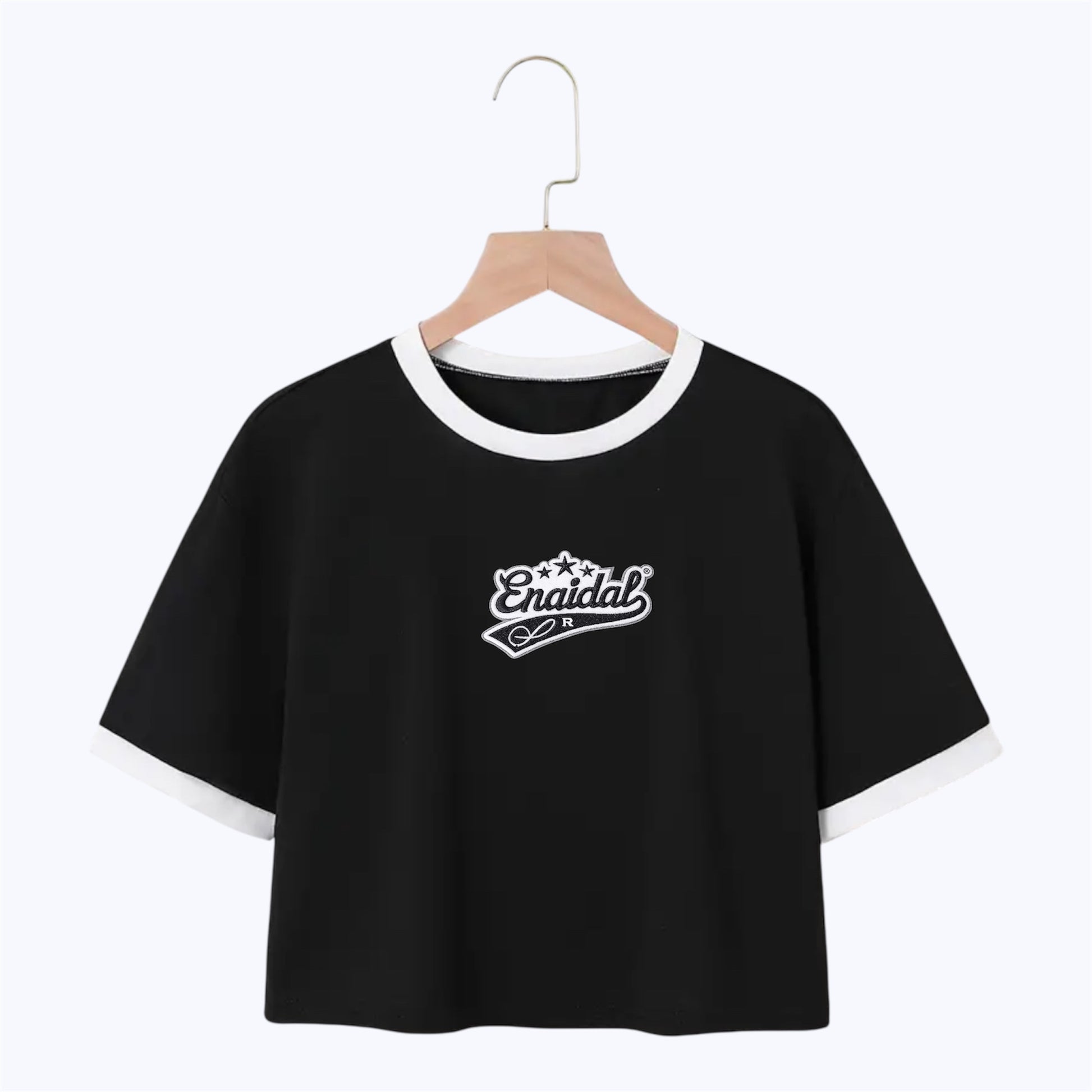 Refresca tu look veraniego con esta camiseta tipo top casual para mujer. Su diseño corto y holgado, con cuello redondo clásico y mangas en contraste, combina estilo deportivo con un toque moderno.