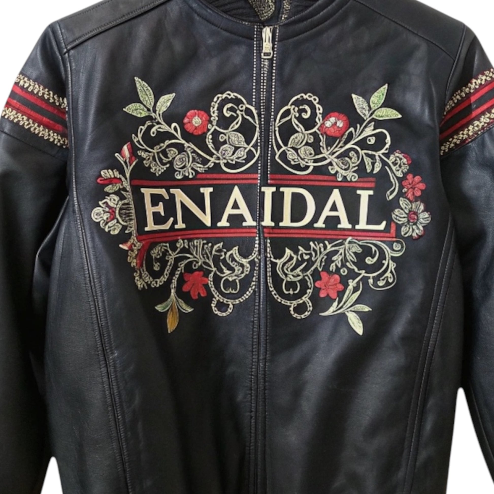 Cazadora bomber de cuero con un toque floral para destacar tu estilo. Esta prenda única, disponible bajo pedido, combina la elegancia del cuero con un diseño floral vibrante. ¡Perfecta para lucir a la moda y expresar tu personalidad!