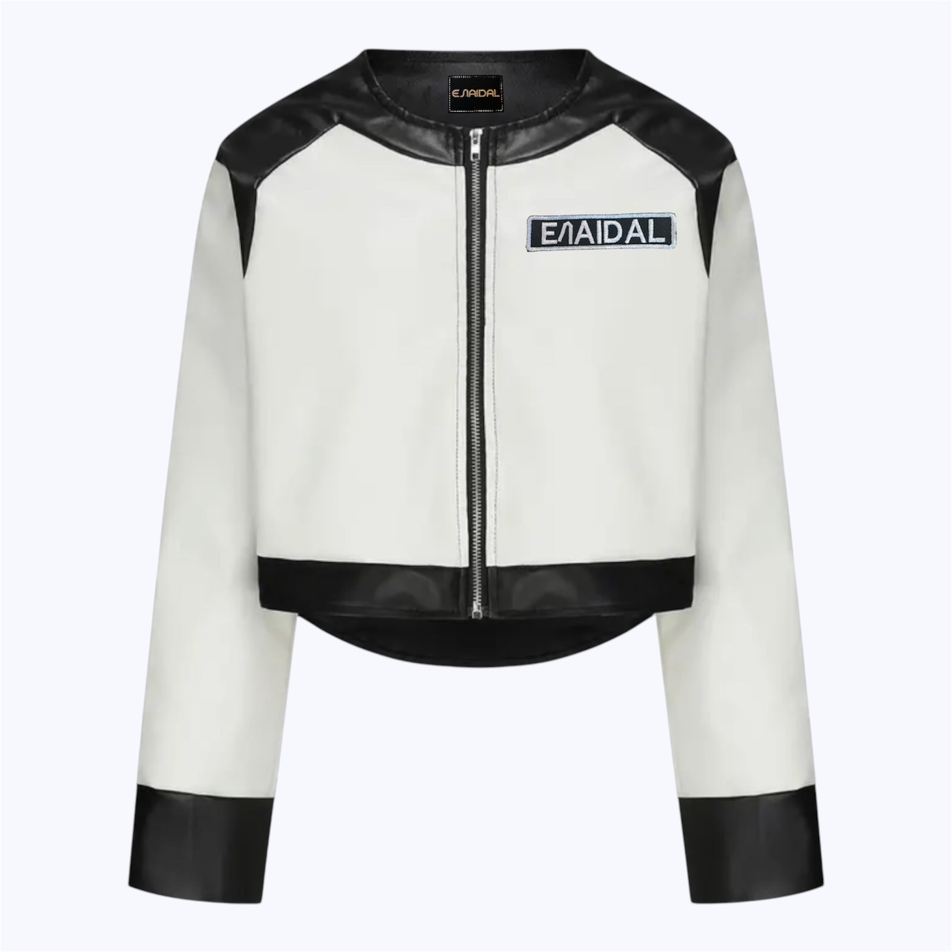Chaqueta corta con cremallera, diseño urbano y parche con el logo de la marca Enaidal en el pecho. Confeccionada en tejido 100% poliuretano, presenta detalles de contraste que realzan su estilo moderno y versátil. Ideal para looks casuales con un toque streetwear.