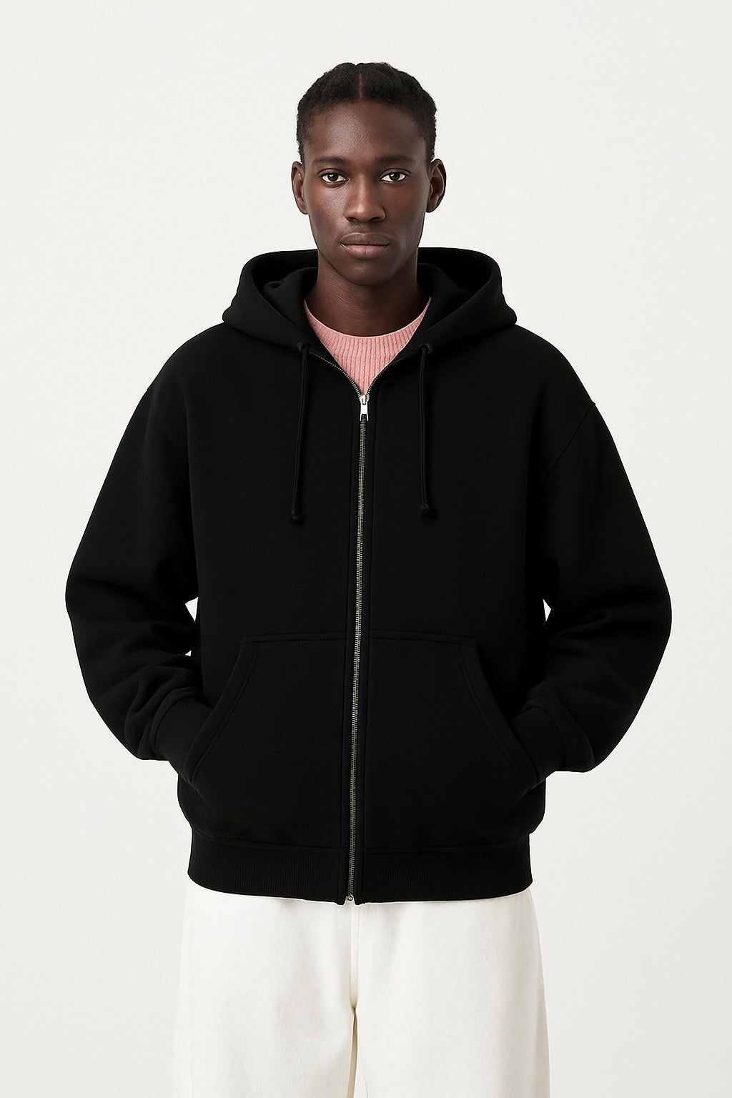 Sudadera de corte amplio con cremallera completa y capucha, diseñada para ofrecer comodidad y estilo en cualquier ocasión. El frente mantiene un acabado limpio y minimalista, mientras que en la parte trasera incorpora un estampado que aporta un detalle moderno y distintivo.